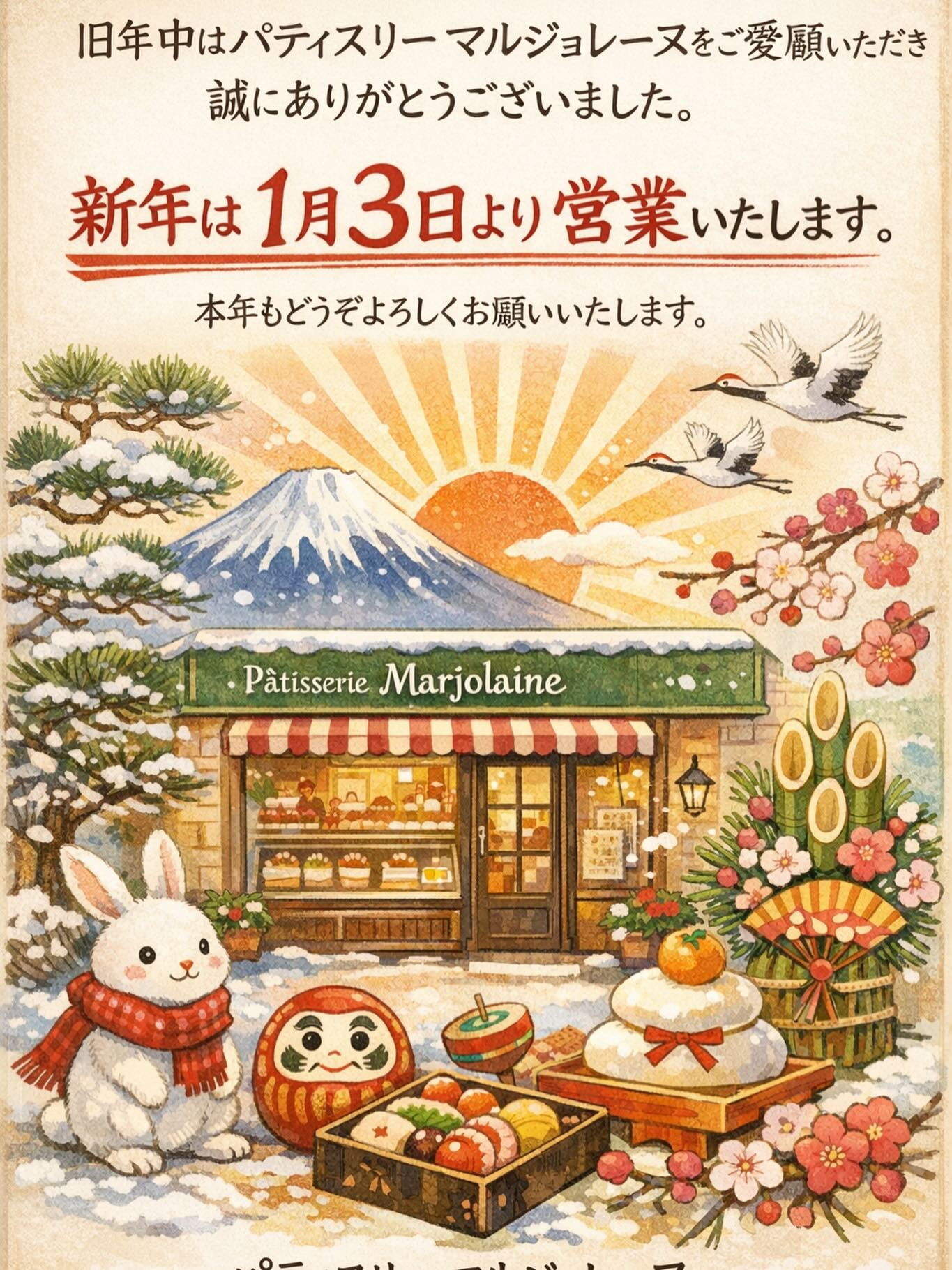 パティスリー マルジョレーヌは平成25年に開業以来、心を込めたお菓子づくりを信条に今日まで歩んでまいりました。